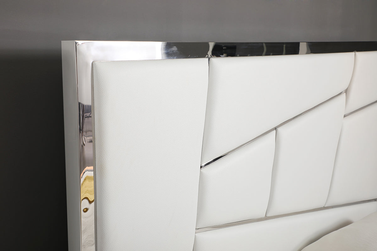The White Chrysler Bed is a marvel of minimalistic design. The modern shapes and silhouette of this bed create angular and abstract shapes on the headboard. These shapes are upholstered in a gorgeous white vegan leather and accented by stainless steel inlay. The white upholstery surrounds the low-profile frame of the bed making the bed flow stylishly.