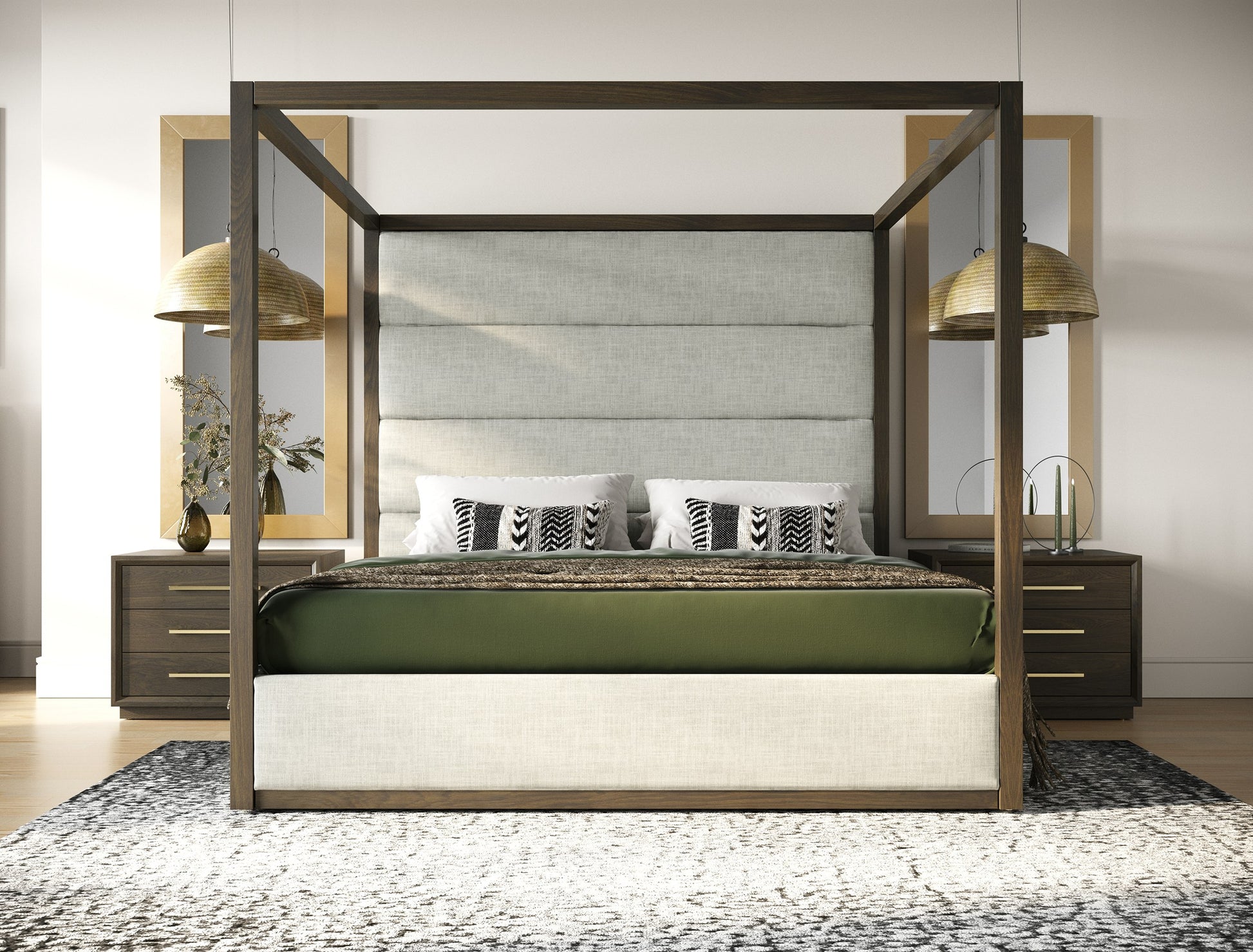 The Modrest Manhattan Contemporary Canopy Cherry Bed is a true statement of elegance and modern luxury. Its bold canopy frame in a rich cherry finish offers an inviting architectural presence, while the light grey upholstered headboard brings a soft, serene contrast. The combination of solid wood craftsmanship and refined upholstery creates a bed that exudes sophistication and comfort, transforming any bedroom into a tranquil sanctuary. Perfect for the discerning homeowner, the Modrest Manhattan elevates the art of restful living, blending style and relaxation in a timeless design.